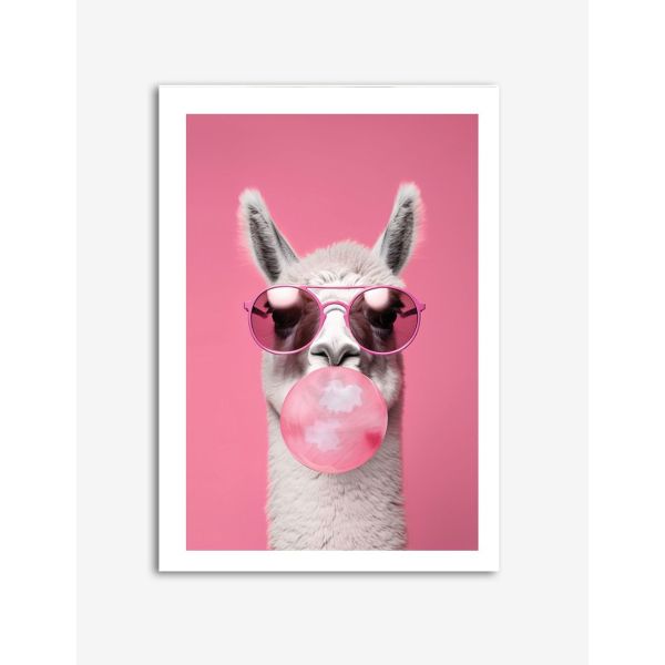 Fügen Sie Ihrer Dekoration eine schrullige und verspielte Note hinzu mit diesem Kaugummi Lama Poster. Das lebendige Kunstwerk zeigt ein Lama mit Sonnenbrille, das einen Kaugummiballon macht, und bringt Farbe und Spaß in jeden Raum.