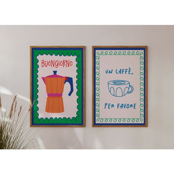 Beginnen Sie Ihre Morgen mit diesem lebhaften Kaffeemotiv-Poster-Set. Mit charmanten Designs mit den Texten 'BUONGIORNO' und 'UN CAFFÈ, PER FAVORE' bringen diese Poster einen spielerischen Hauch in jede Küche. Perfekt für Kaffeeliebhaber, das Produkt enthält nur ein Set aus 2 Postern.