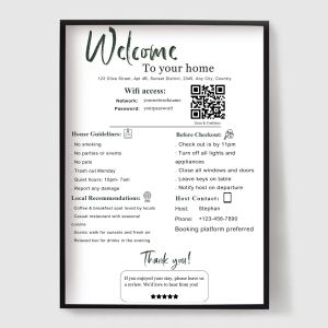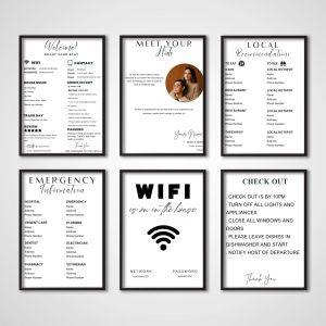 Von WiFi-Schildern und Hausregeln bis hin zu Check-in Anweisungen, Notfallinformationen und lokalen Empfehlungen, helfen unsere Poster Ihnen, alles, was Ihre Gäste brauchen, klar und schön zu kommunizieren. Perfekt, um ein professionelles, nahtloses Gästeerlebnis zu schaffen und gleichzeitig Ihr Interieur aufzuwerten.
